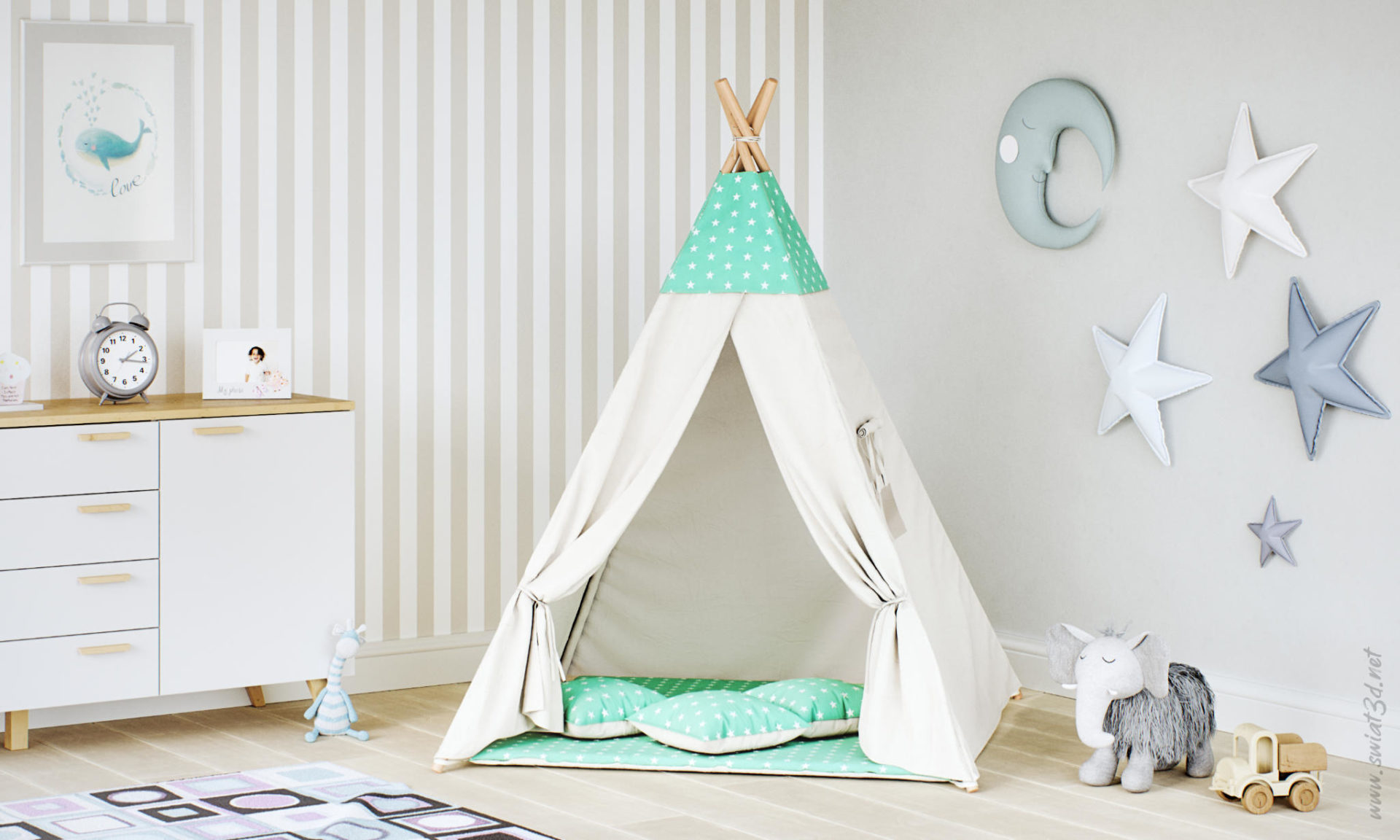 Wizualizacja produktowa namiotu dla dzieci w aranżacji w stylu skandynawskim.